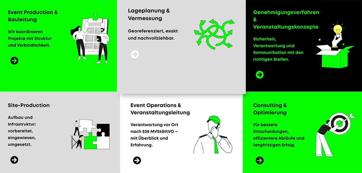 - Erstellung kurzer Leistungs-Teaser zu Event Production, Lageplanung, Genehmigungsverfahren, Site-Production, Event Operations und Consulting