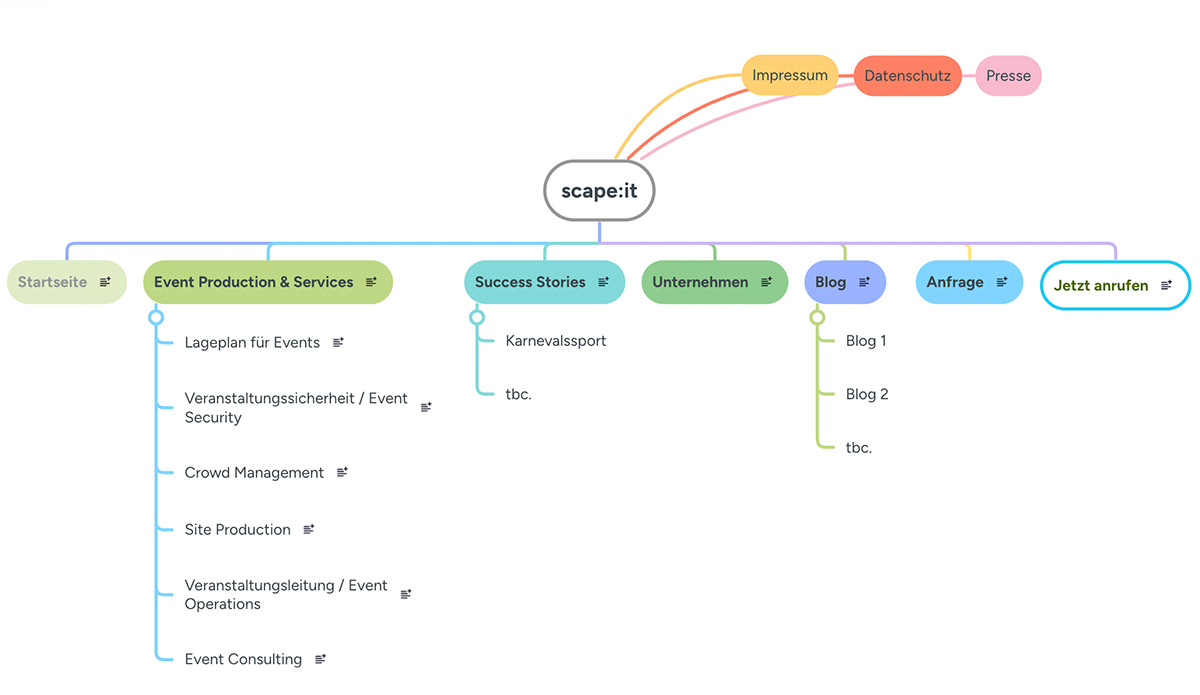Im nächsten Schritt habe ich auf Basis des Briefings die Sitemap und inhaltliche Struktur entwickelt. Ziel war eine Nutzerführung, die den tatsächlichen Ablauf von Eventprojekten widerspiegelt – von der Planung bis zur Umsetzung vor Ort.